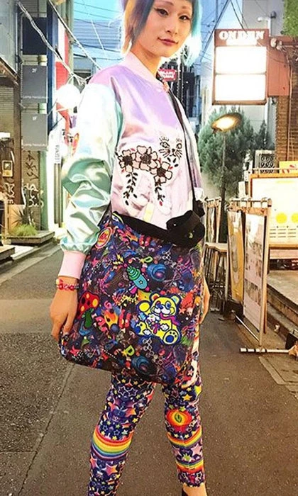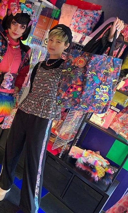 A 2-way shoulder bag made of the original Neon Spectrum print that features neon colors and printed gem studs. Itβs also decorated with original, pop-art style patches for a super cute look. Adding a colorful pattern to an outfit is always a good mood booster! You can carry it not only on your shoulder, but as a tote bag too with the shorter handles. Inside is a convenient small pocket to hold your keys, smartphone, or other small necessities.