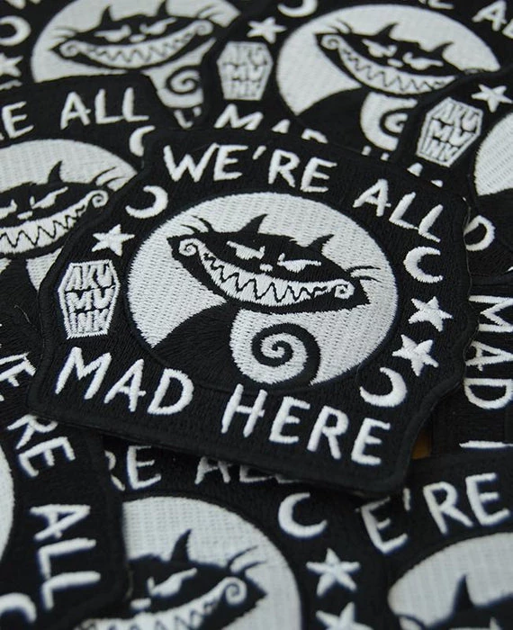 We’re All Mad Here embroidered patch with iron-on backing.