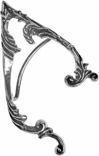 A polished, antiqued pewter pointed elf-ear-shaped ear-wrap fashioned from decorative, floral scroll work and neatly framing the ear – can be gently squeezed to comfortably fit your own ear; fastened at the lobe with one surgical steel ear-post.