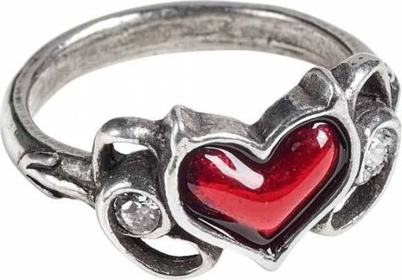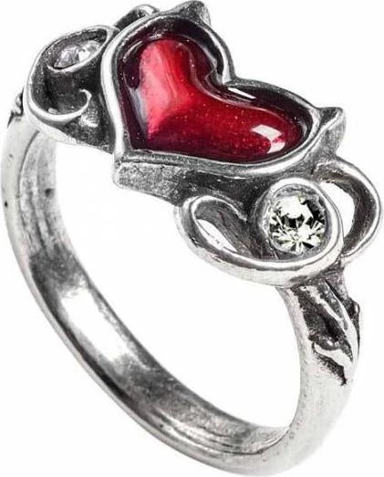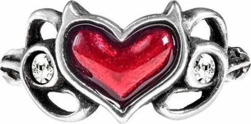 A delicate pewter ring of a blood-red enamelled Devil’s heart flanked by two Swarovski white crystals.