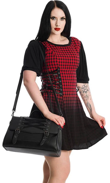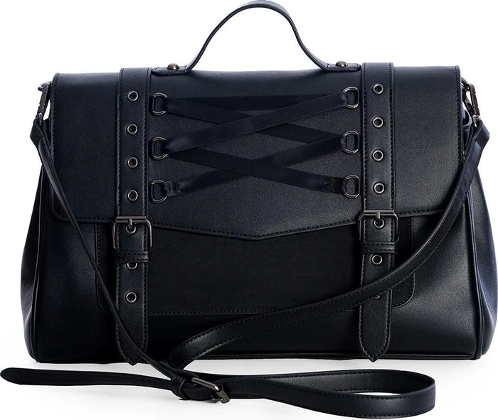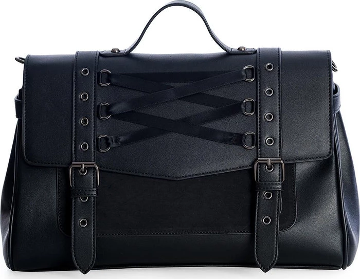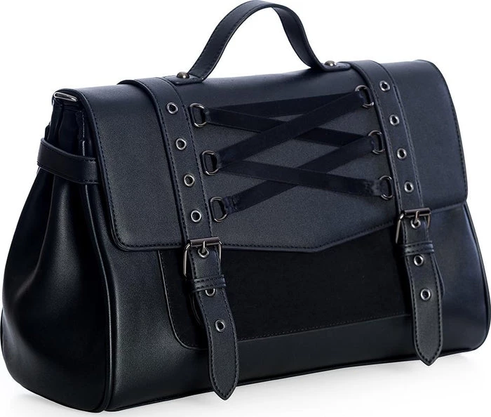 The satchel of a witch or an adventurer, off to tame mythical beasts. Faux buckle straps top button clasps on this delicately corset-laced handbag, with both top handle and optional shoulder strap.