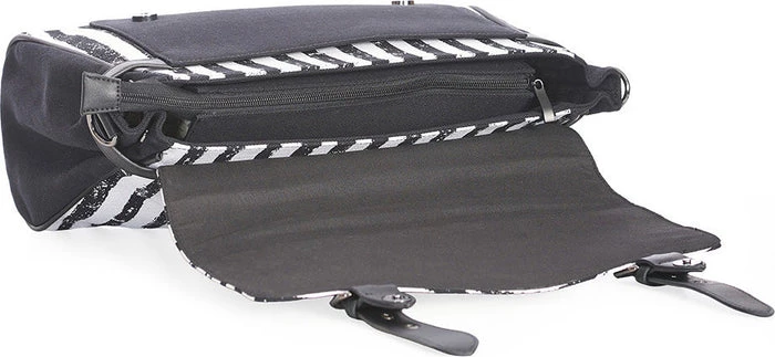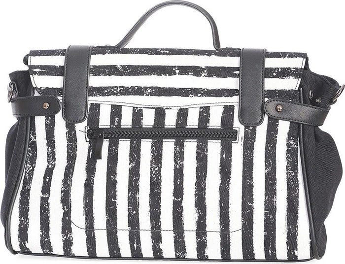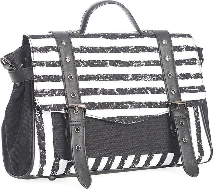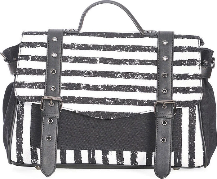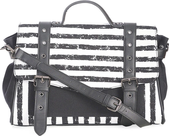 This black and white cigarette-style, striped grungyΒ messengerΒ bag is perfect for anyone and super roomy for all your bits and pieces! FeaturingΒ faux leather eyelet straps and black accents this bag is totally punk. Pair this bag with the Spooky Nightwalks pants,Β knee-high boots and a black t-shirt for a punk casual aesthetic!