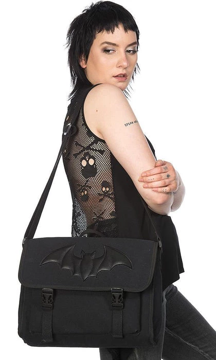 Your bag needs a subtle 3D bat pal, to keep your belongings safe. This black messenger style bag is big enough for your books or laptop, making it the ideal alternative work, school or uni bag.