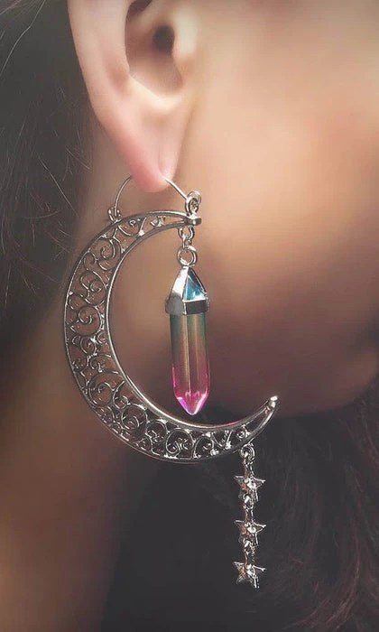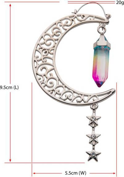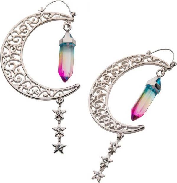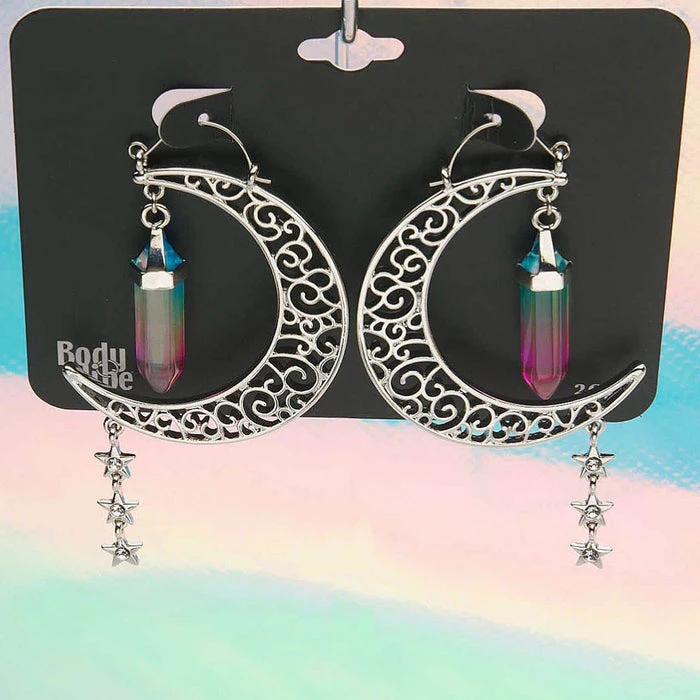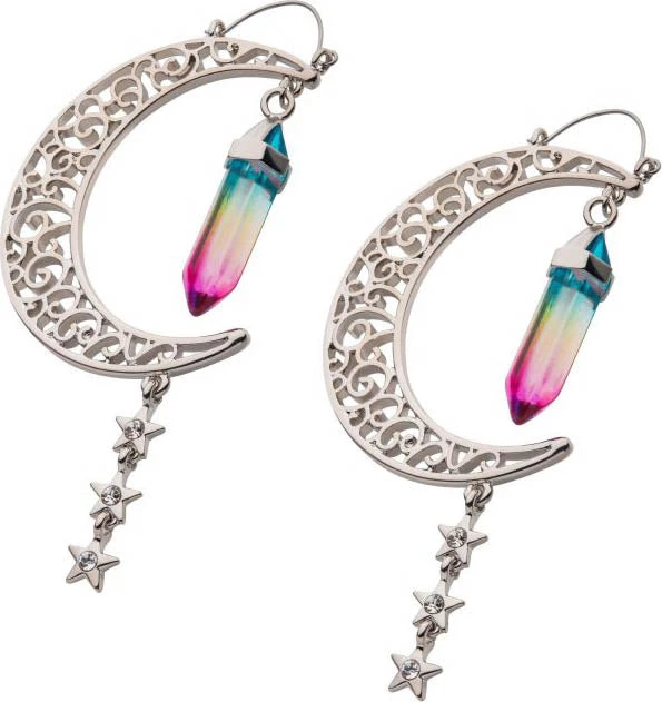 Filigree Crescent Moon with Oil Slick Crystal & Triple Star Dangle Plug Hoops. Sold as Pair.