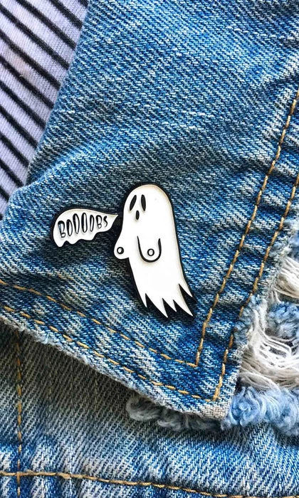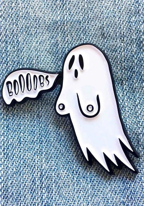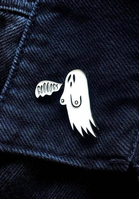 This enamel pin makes a funny addition to any spooky pin collection. It features a big breasted ghost with a speech bubble that says, “Boooobs”. This quirky fashion accessory is sure to bring a laugh. Made from black plated metal with white enamel fill. A metal clasp on the back locks this pin in place. Ideal for alternative and nu goth fashion.
