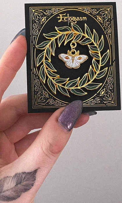 This truly unique enamel pin features a wreath of leaves at the center of which hangs a white moth charm. Look closely at the moth and notice the surreal pair of eyes looking back at you from its wings.Β