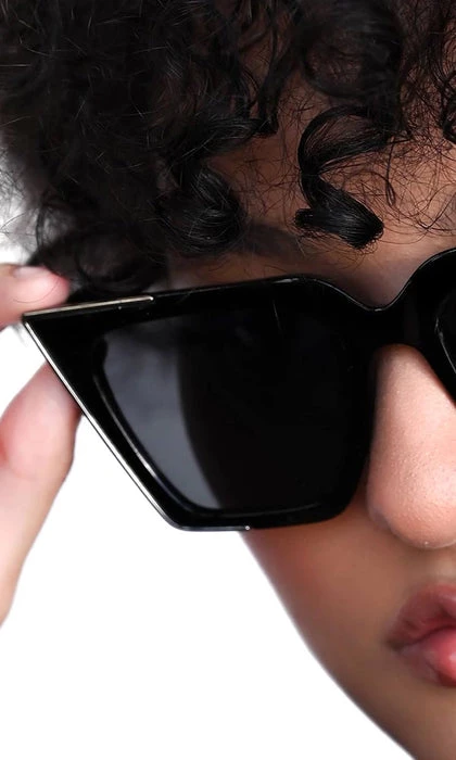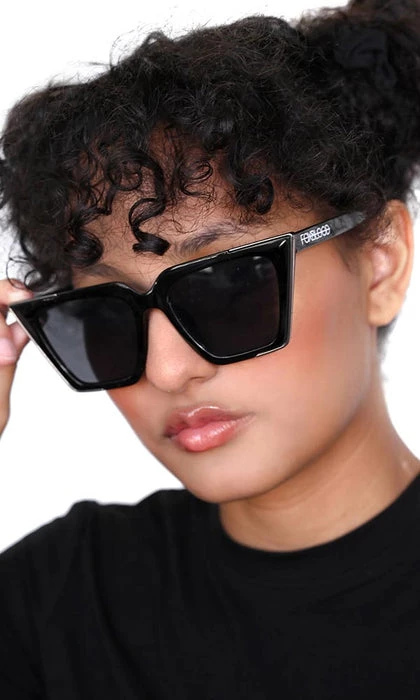 Black cateye sunglasses with silver edge details. FOXBLOOD logo in white on the left arm.