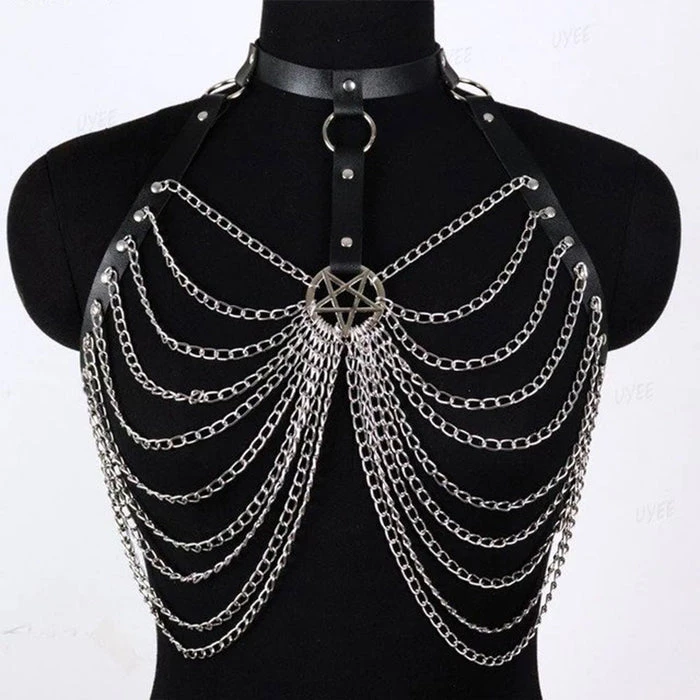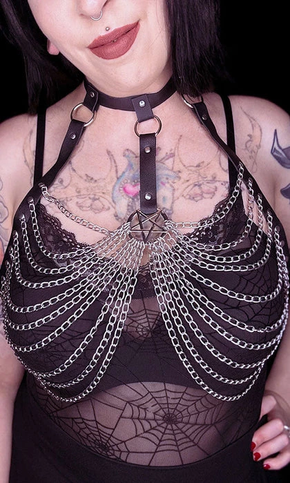 Be my Beelzebabe? ~ Don the Beelzebub harness and feel like the sexy demon you are! Featuring a Pentagram charm, chains and O-rings this harness is perfect for accessorisingΒ and styling your favourite outfits to the next level!Β