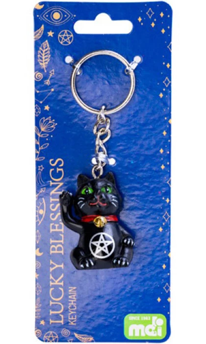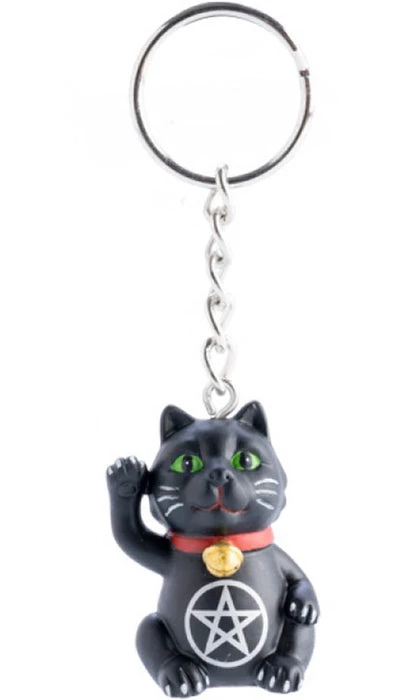 This mystical keychain is shaped like a lucky black cat. It features vibrant green eyes, a golden bell and pentacle design on a traditional keychain ring.