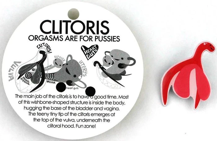 Put your clitoris where you can always find it — on your chest! Adorable 1.25″ clitoris pin shows the full wishbone shape of this remarkable, fun-loving body part, most of which lies insideΒ the body.Β