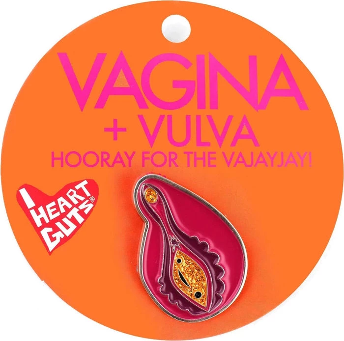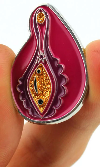 Enamel vagina and vulva pin, now with a sparkly smiling vaginal opening and matching sparkly smiling clitoris. Bling your badge reel with a sparkly vulva pin and watch your labor & delivery unitΒ go green with envy. Can’t go wrong with a glittery anatomical vagina pin gift. Cute vagina gifts all around at the OBGYN or IVF clinic! Caring for vaginas should be rewarded with an adorable vagina lapel pin.