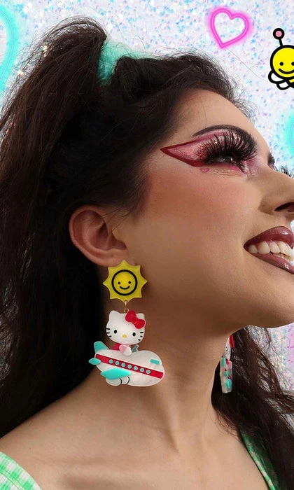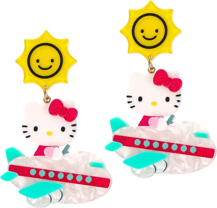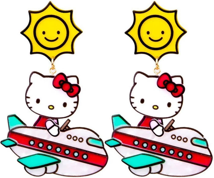 Hop on board and go on an adventure! These super cute earrings have a sun and a cloud base, with a Hello Kitty on an airplane underneath! Sure to start conversations and be a solid favourite in any statement jewellery lovers wardrobe! Add them to your hand luggage today!