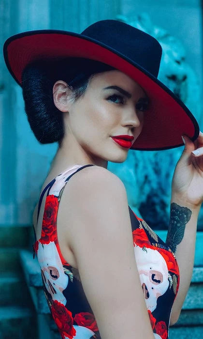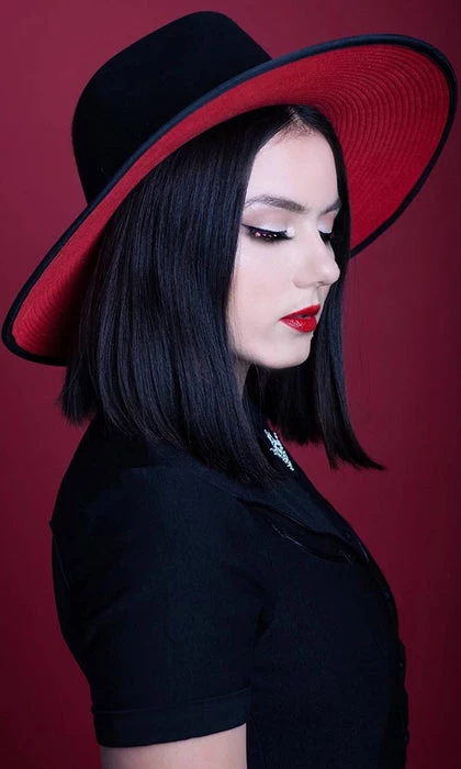 This classic piece is sure to be an inviting addition to any wardrobe. The Dracula hat possesses a deep black exterior, paired with the contrasting blood-red brim, and is aptly named after one of the most iconic figures in Gothic literature. No wonder it’s one of Katakomb’s most seductive pieces to date!Β