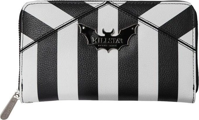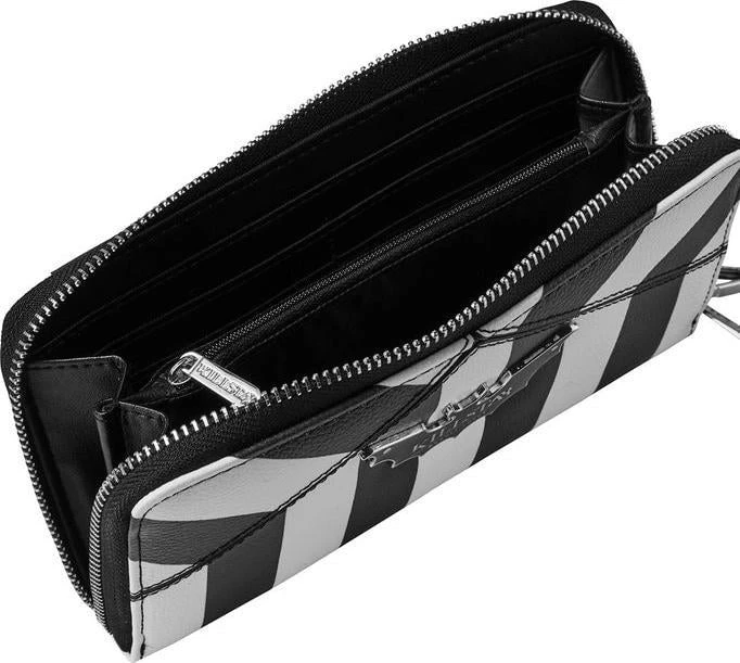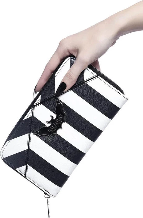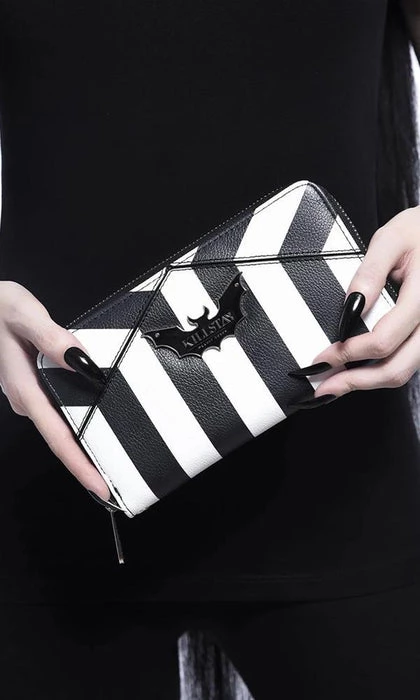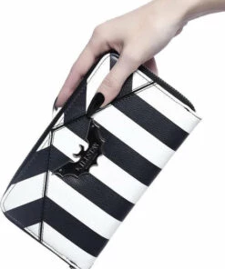 TheΒ ‘Never Trust The Living’ wallet is finished in aΒ faux leather body adorned with a block-stripe print, branded bat plaque and complete with multiple storage compartments + zip closure. Keeps yourΒ change, notes, cards, spells, old talismans and more safely stored.Β Halloween is every day!