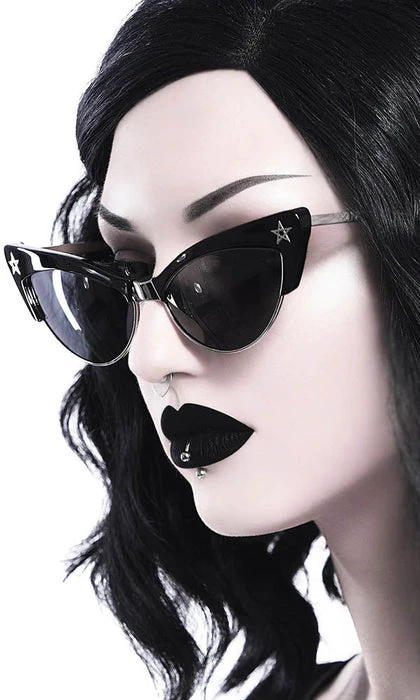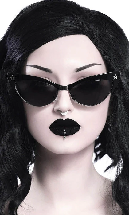 Add a touch of evil with the ‘Drucilla’ sunglasses.Β Perfectly sizedΒ cat-eyeΒ silver frames with contrasting black tops and pentagram hardware detailing. With black tinted lenses, of course. UV protection.