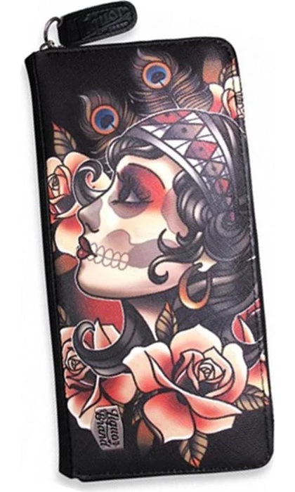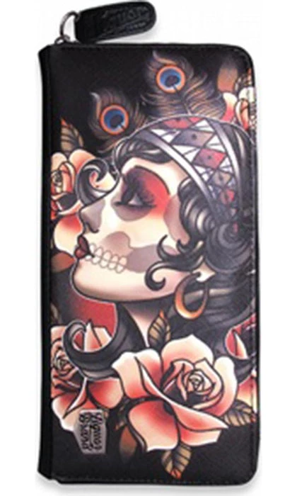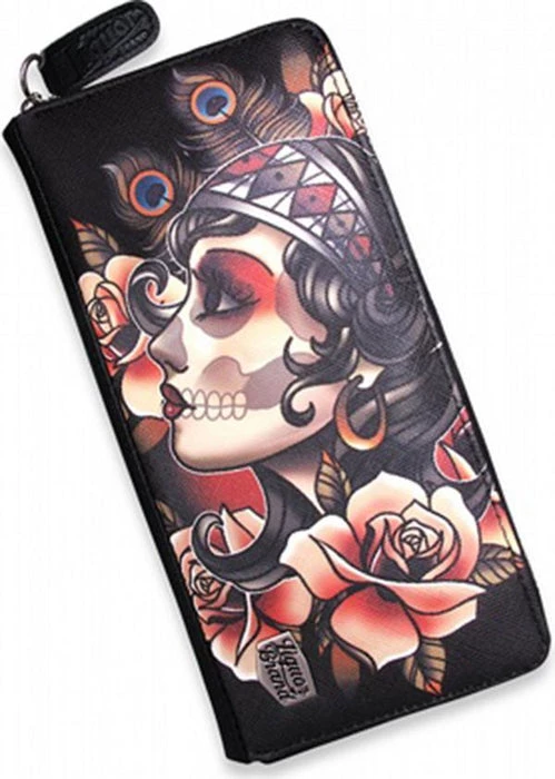 This stunning Dia de los Muertos inspired design features a sugar skull mystic surrounded by peacock feathers and rose flowers. The Mystic Rose Wallet from Liquorbrand is amazing for everyday use!