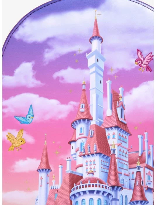 In this stunning design, a dreamy sunset floods the sky behind the breathtaking castle from 1991βs Beauty and the Beast. Featuring incredible detail, the castle stands as tall and proud as ever, encircled by shiny gold sparkles and adorable embroidered birds. But the details donβt stop there. The interior of the castle is revealed by unsnapping the buttons behind the front design! At the top, the forbidden West Wing can be seen in disarray from the Beastβs inner torment as the enchanted rose glows by the window. Below, the Beast dances with Belle in the magnificent ballroom as Lumiere, Cogsworth, Mrs. Potts and Chip look on and in the next room is the incredible library that takes Belleβs breath away.Β