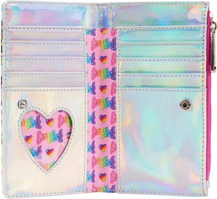 “You gotta have it!” Add a splash of color to your wardrobe with the Loungefly Lisa Frank Iridescent Flap Wallet. This bifold wallet displays an all-over print of some of Lisa Frank’s most popular designs. Much like the stickers and stationery of the 80s and 90s, this item features a bold and bright pattern against a shiny silver iridescent background. Look around and you will find characters such as Panda Painter, Angel Kitty, Markie the unicorn, and more. With 7 slots for holding cards and a clear slot to hold your ID, this nostalgic accessory will keep your belongings safe and accessible wherever you go. This wallet is an officially licensed Lisa Frank product.
