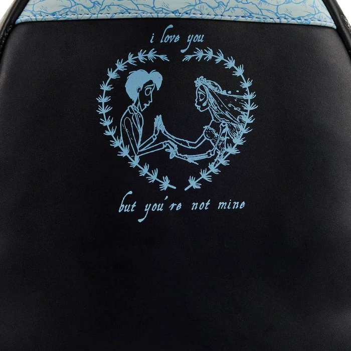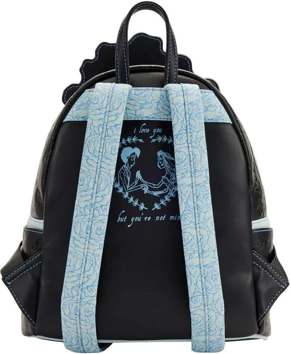 Who will catch the brideβs bouquet next? The Loungefly Corpse Bride Emily Bouquet Mini Backpack proves that romance isnβt just for the land of the living. On the front zipper pocket, dusty blue roses make up a floral arrangement for Emilyβs wedding day. Up above, Emily gazes down at the bouquet from behind her mesh bridal veil. Maggot joins in the celebration as an enamel zipper charm, providing easy access to any essentials. Turn the bag around to find critters printed along the bagβs side panels while a blue rose motif continues onto the backpack straps.