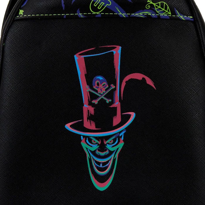 Conjure up a few friends from the other side to help carry you through the day with this The Princess and the Frog Dr. Facilier Glow and Lenticular Mini Backpack. On the front of the backpack, tarot cards wait to be turned over to reveal the future. Through sleight of hand, in an alternate view through the lenticular screen, the cards reveal hopeful wishes for Naveen. All the while, Dr. Facilierβs ominous hat and feather rise above the front zipped compartment–and glow-in-the-dark details bring him to life. In the dark, the skull and crossbones on the hat glow, and so do Dr. Facilier’s eyes and skull face. This accessory complements any Disney outfit and is perfect for Disney fans wishing to keep their favorite animated moments close.
