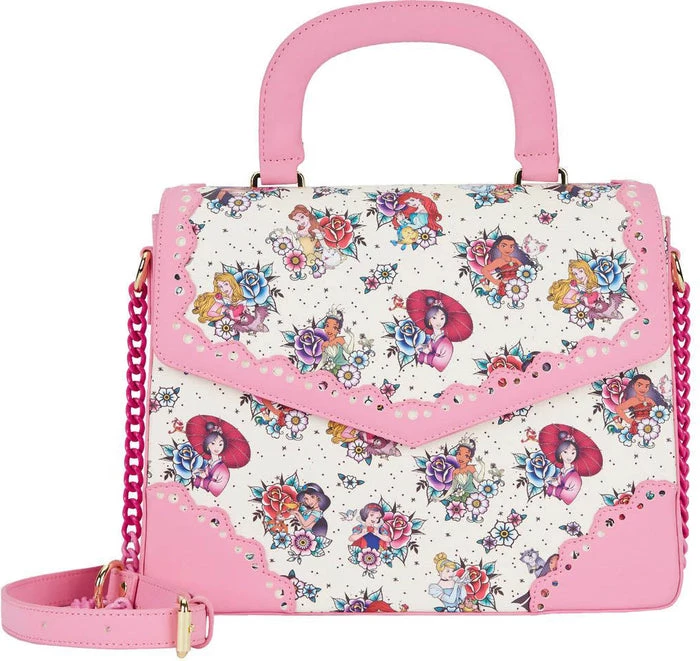 Princess power is in full bloom. Take the strength and charm of the Disney Princesses with you wherever you go with this Disney Princess Floral Tattoo Crossbody Bag. A classic tattoo style rose debossed motif punctuates the cream-colored background on this bag. The following Disney princesses can be found among the flowers: Mulan, Cinderella, Snow White, Belle, Moana, Aurora, Ariel, and Tiana. Pink accents, including a pink-colored ombre chunky chain shoulder strap and lacey details fashioned from vegan suede, frame the motif. This crossbody bag is the perfect complement to any Disney outfit.