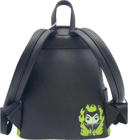 On the front of this backpack, Maleficent as the iconic dragon comes to life with custom-shaped applique and vibrant colours. Green fire flows from her yellow jaws, creating a wall of flames for the front zipper compartment. Her black scales cover the body of the backpack and on the back, she is seen in her normal form, striking a strong pose among green flames. The backpack even includes glow in the dark features!