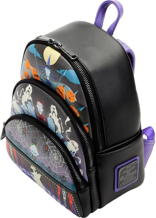 The Loungefly Nightmare Before Christmas Glow Triple Pocket Lock, Shock, and Barrel Oogie Boogie Mini Backpack is made of vegan leather (polyurethane). Bag has adjustable shoulder straps and sturdy metal hardware. Additional features include embossed, printed, and glow-in-the-dark details. Take note of the coordinating inside lining.