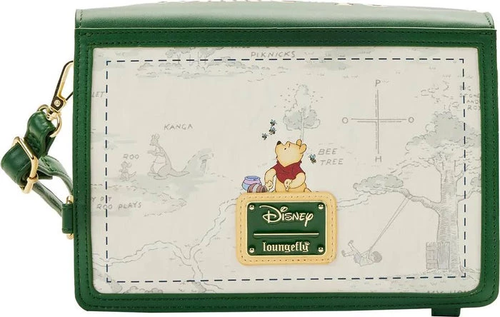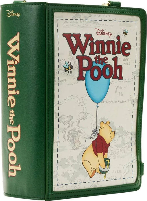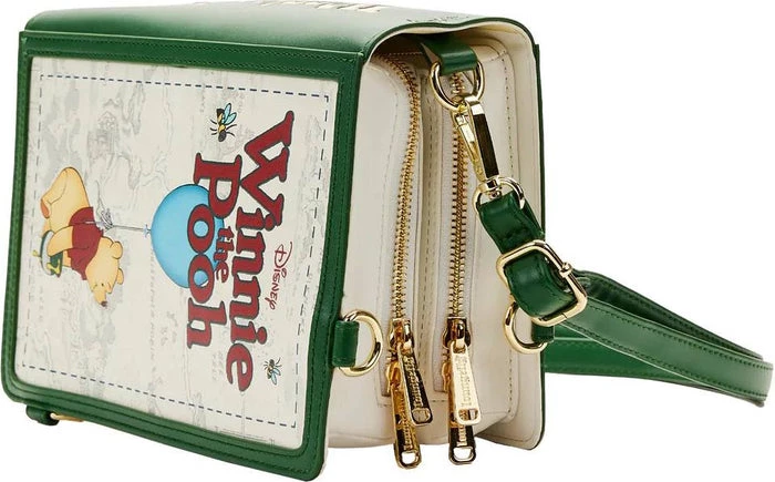 Book a delightful trip to the Hundred Acre Wood with this Loungefly Disney Winnie the Pooh Classic Book Cover Convertible Crossbody Bag. On the outside, Winnie the Pooh comes to life in amazing color detail, suspended from a balloon as he travels over an outline-map of the Hundred Acre Wood. When the βbookβ is opened, youβll see some familiar character scenes and famous lines come to life in print. Even the spine, down the middle of the opened βpage,β contains delicious details, including a bucket of honey at the top that pours down the centerβand more scenes of Pooh and Rabbit. On the back, Winnie the Pooh makes another appearance with his bucket of honey and a few bees. Join Winnie the Pooh, Christopher Robin, Kanga, Roo, Tigger, Eeyore, Owl, Piglet, and Rabbit on all kinds of sweet-as-honey adventures. Capture a favorite Disney moment and keep it closeβor turn everyday adventures into sweet memories.