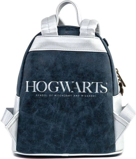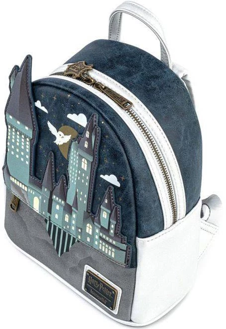 This mini backpack features the magical school in a custom-shaped design, with the building popping out from the backpack thanks to the embroidered and applique details. The blue and grey hues give the fashion accessory a magical aesthetic, with details like the Hogwarts zipper charm and printed Hedwing interior lining adding to the premium look and feel.Β The backpack includes an elegant metal plaque, adjustable shoulder straps and two zipper closures.