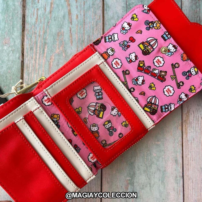 On the front flap, Hello Kitty visits a popcorn stand run by Tippy. This scene comes to life in applique detail, with an umbrella shape that rises up over the top. A bold pop of red fills in on the flap behind them. Below them, there is an all-over-pattern that wraps around the back. The pattern features an entire carnival with food stands and rides, surrounded by neighborhoods, pocket parks, fluffy clouds, rainbows and smiling suns. Inside, youβll find 5 slots for carrying cards. Itβs the perfect accessory for exploring a local carnival or fairβor for turning everyday moments into sweet memories.