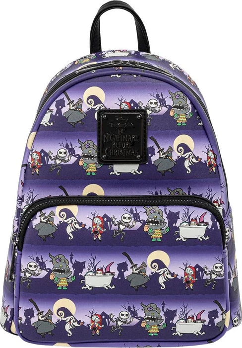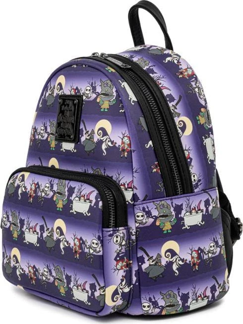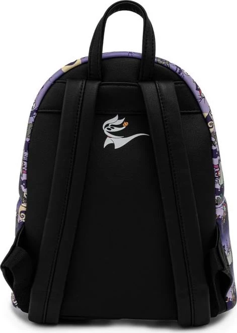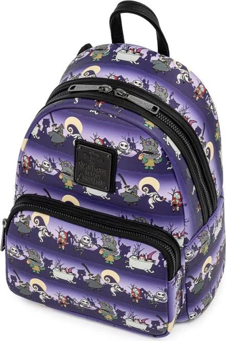 Creeping along the spooky Halloween Town scene of this backpack are Jack Skellington, Sally, Zero, the Mayor, Lock, Shock, Barrel and the Harlequin Demon. Theyβre all stylised as vibrant cartoons, ensuring their bold colours pop out against the silhoutted Halloween Town.Β