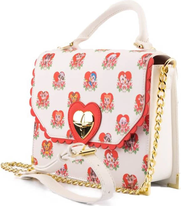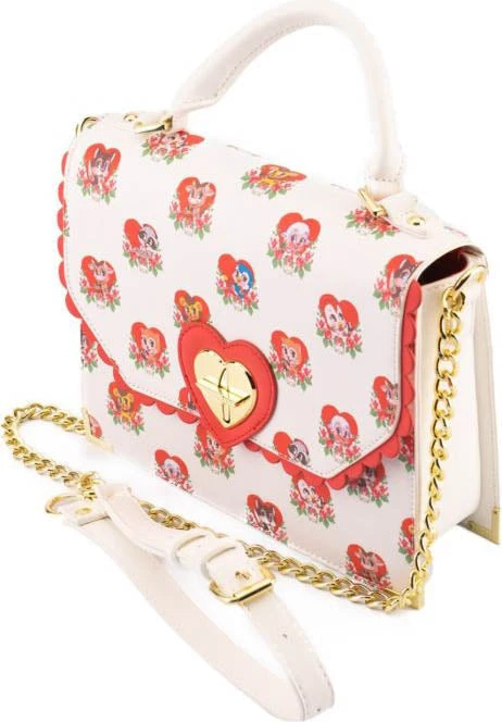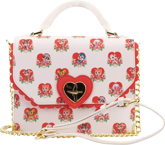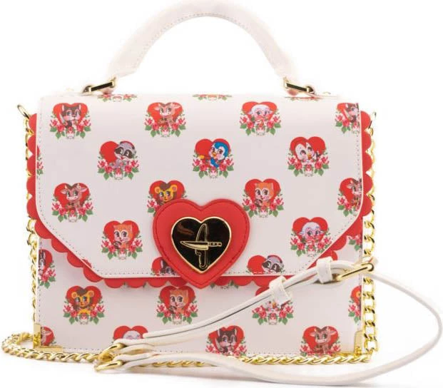 Donβt let their sweet, innocent faces fool you! The all-over print of this bag features an array of cute, loveable critters – with a villainous twist! Each have their own weapon on hand while maintaining their harmless, big-eyed and rosey-cheeked illusion. The hearts theyβre hanging out in adds to their facade, each one adorned with roses for that extra sweet appearance.