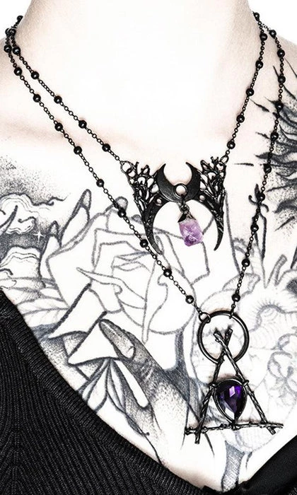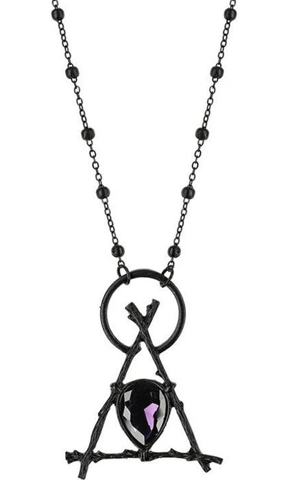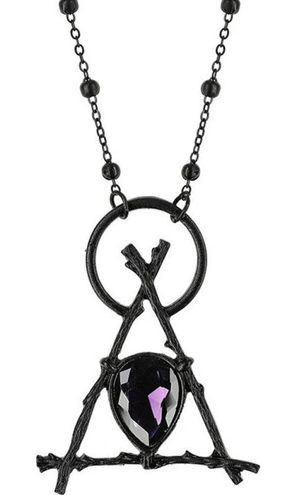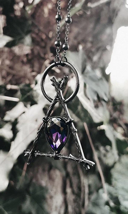 Aesthetic symbol of delta letter with edges shaped as branches and circle above it. There is a purple glass stone in the middle of pendant. It composes perfectly with the pendant giving the Gothic dark aura.