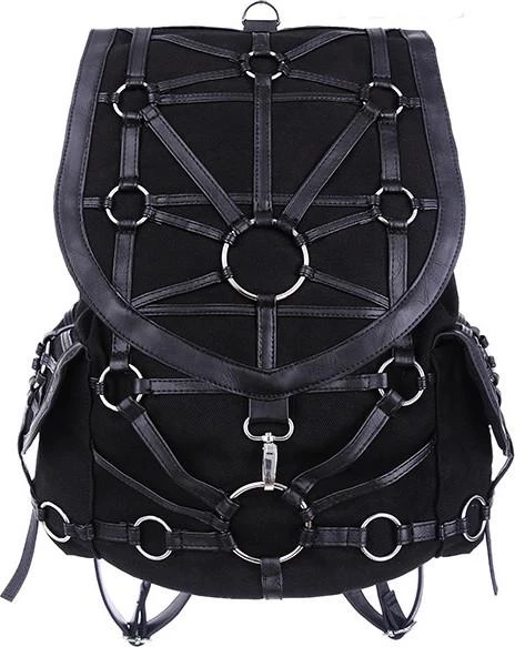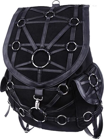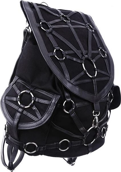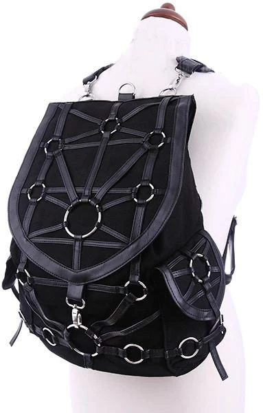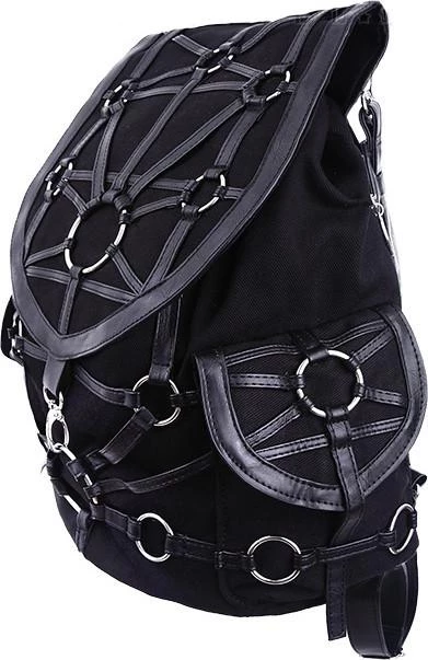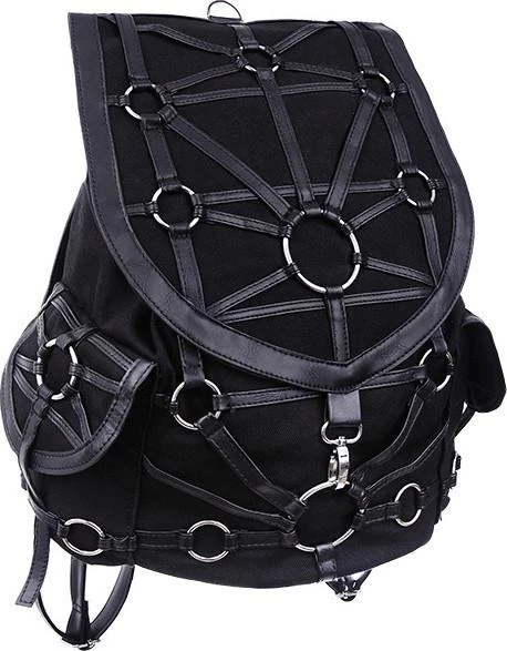The backpack is entirely covered with faux leather straps connected to metal O-rings and has a soft internal lining and zippered pockets.