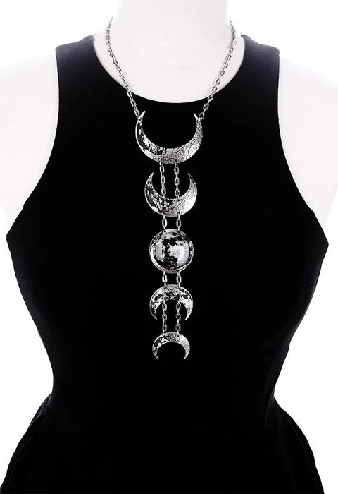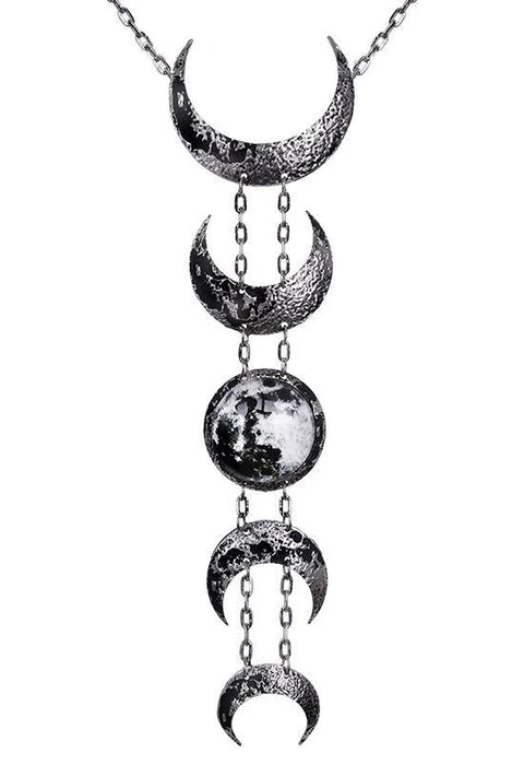 Restyle’s Lunar Silver Necklace presents moon phases carved in an alloy. In the centre of the necklace, there is a graphic of a moon underneath the magnifying glass. The necklace is antique silver in colour.
