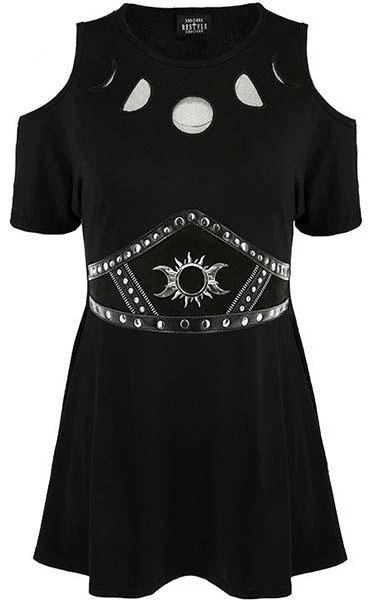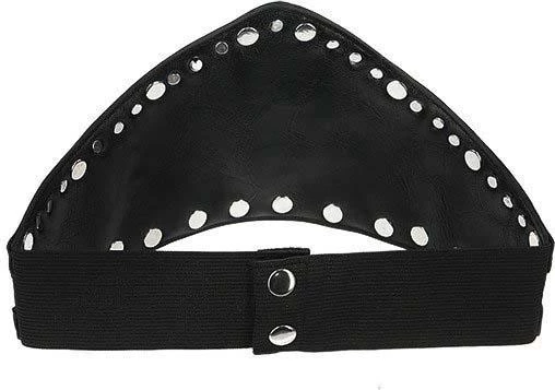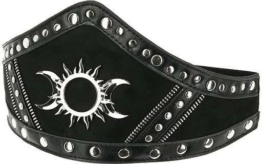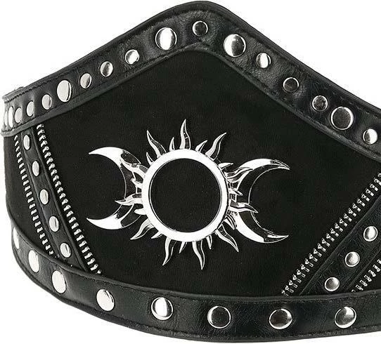 We present an elegant take on the waist belt with this PU leather-trimmedΒ gothic design.Β This Goth waist belt has been crafted fromΒ faux suedeΒ andΒ decorated with a contrasting Pu leather details.Β Triple Goddess MotifΒ and rivet hardware stands out against the black background.Β The style has an adjustable strap that fastens around the waist, closes on the back with a snap detail.Β Let yours cinch a billowing black dress or a pencil skirt for a magical look!
