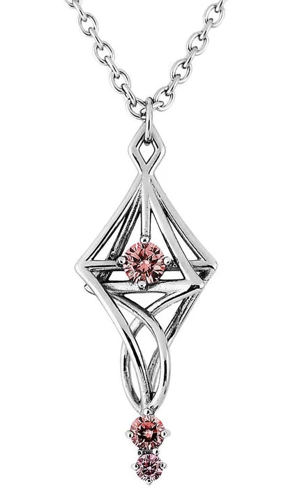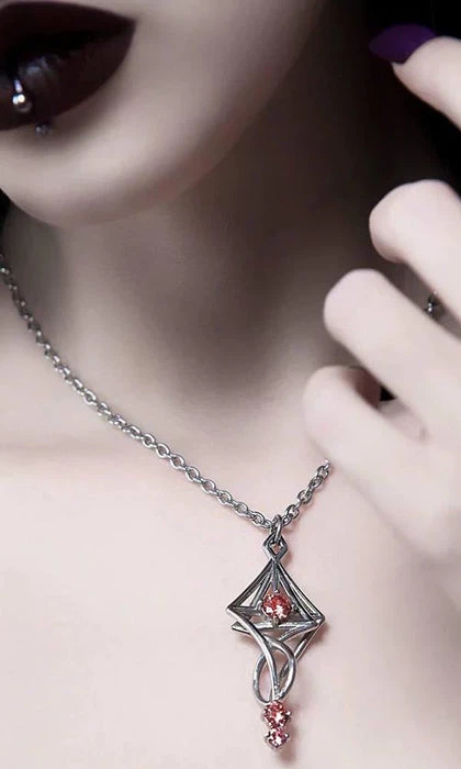 A beautiful Stainless Steel pendant with a Mirror Polish finish, adorned with three sparkling Rhodolite-colour gemstones, hanging on a Silver-plated chain.