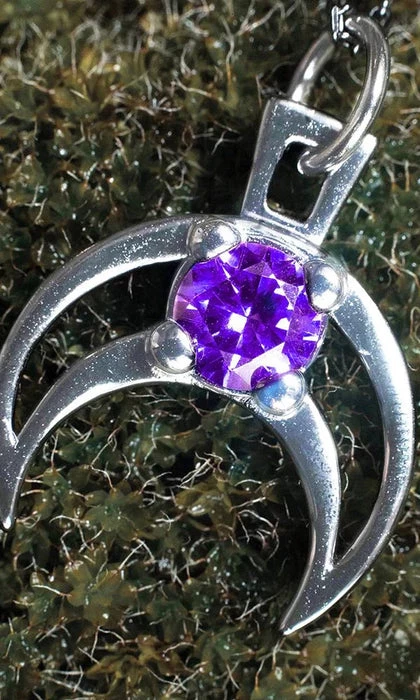 A beautiful Stainless Steel pendant with a Mirror Polish finish, adorned with an enchanting Amethyst-colour gemstone, hanging on a Silver-plated chain.