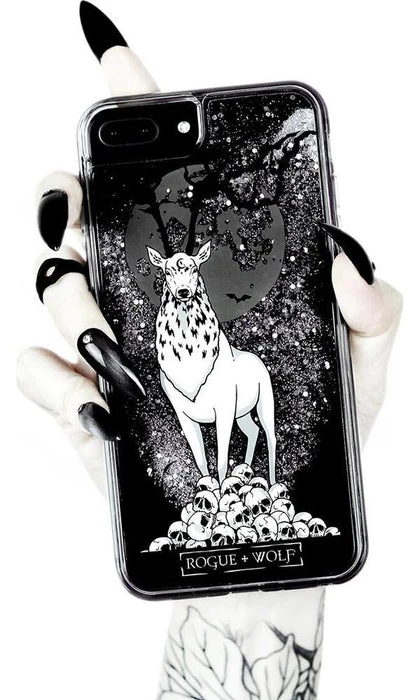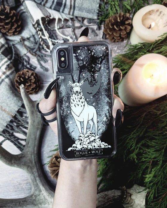 An Enchanting Phone Case featuring a gentle Stag Guardian atop a mound of skulls & bones of the fallen that dared to trespass, with a magical Silver Liquid Glitter background to represent the translucent impermanence of our mortality.