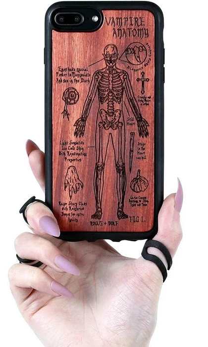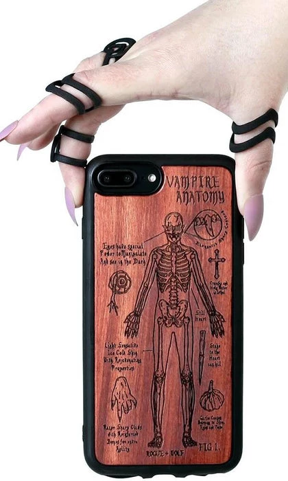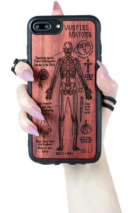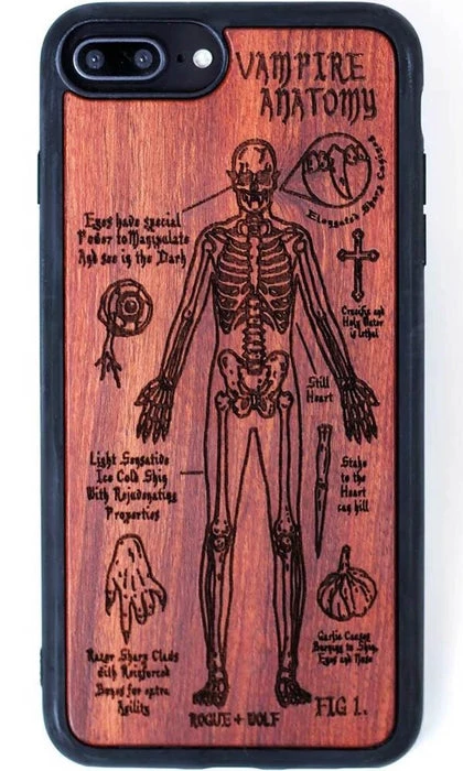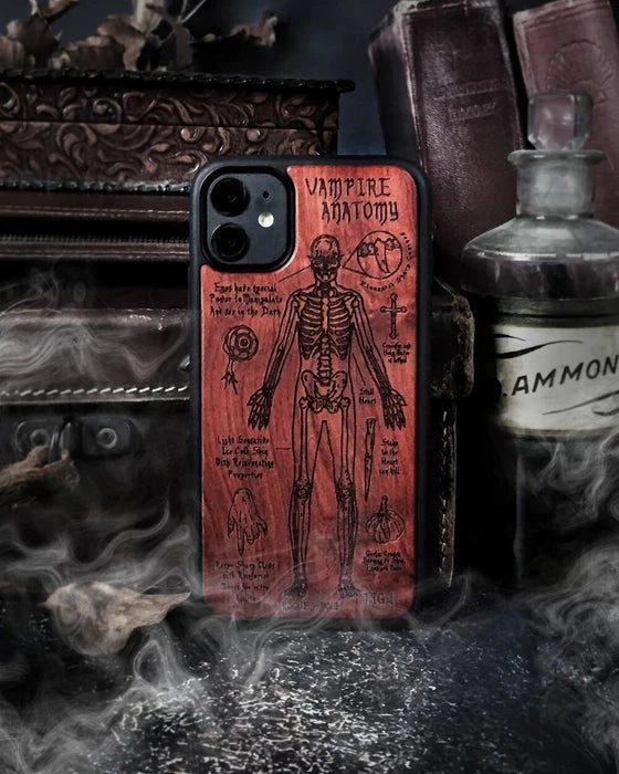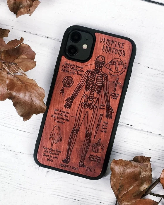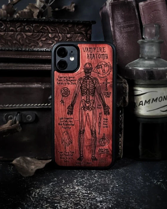 A Vampire’s Anatomy Wooden Phone Case engraved with an anatomical diagram of a creature of the night. Study it and study it well, it may just save your life!