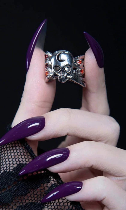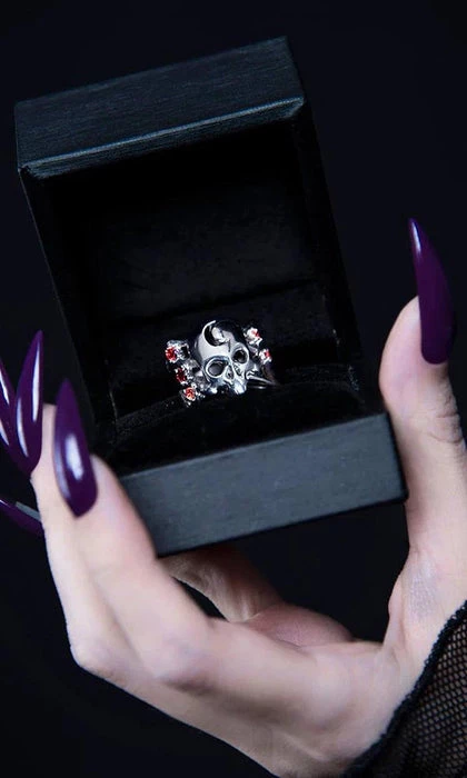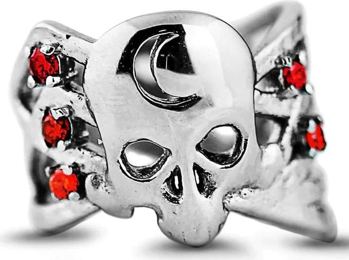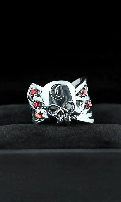 A memento mori ring of a skull marked by the crescent moon. Stars orbit around it, connecting you with the unimaginable vastness of spacetime.