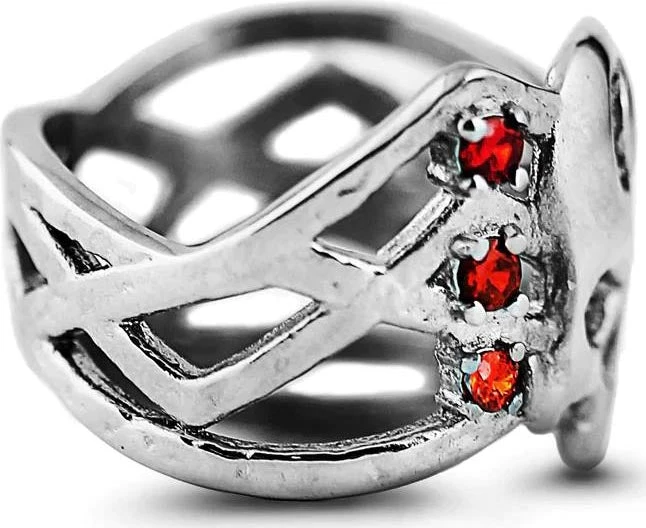 A magical Stainless Steel Ring with a Mirror Polish finish, decorated with an explosion of gemstones in deep reds and oranges, nestled upon the timelines like embers of a burned out star.
