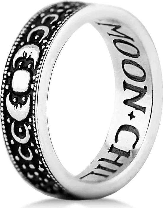 A Stainless Steel band 3D sculpted with the phases of the moon nestled among a starry sky, hand-dyed black, with “Moon Child” inscribed on the inner band.