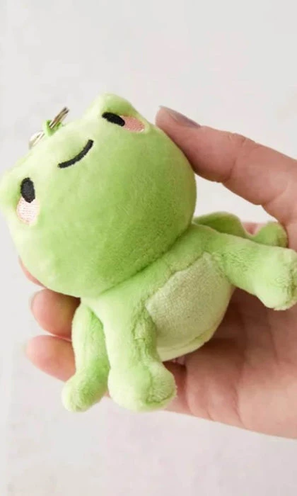 Hop around town with this little buddy in tow. Ultra-cute frog-shaped plushie featuring a clip keychain for attaching to your bag, keys or wallet.