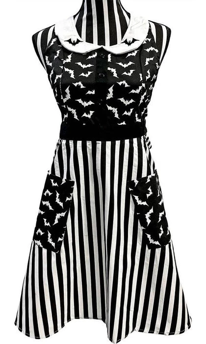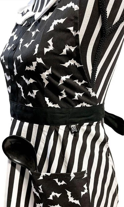 Get dolled up, even at home! Home chefs can rejoice βΒ Sourpuss have brought theΒ favourite Luna Bats pattern to the kitchen! This Sourpuss apron features a cute peter pan collar, buttons, and two large front pockets. It will keep the food spatters off of you, while still showing your personality!