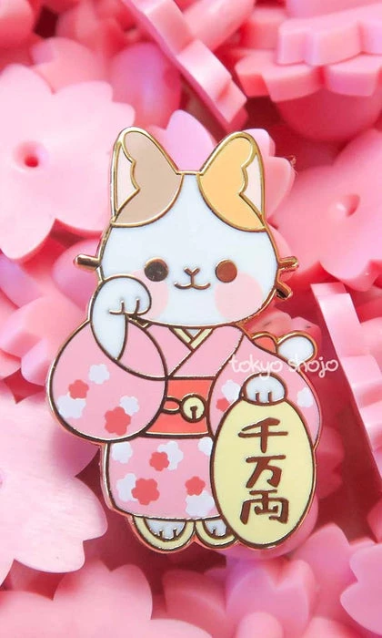 A lucky calico cat, beckoning prosperity with itβs raised right paw and holding a koban coin. Pink is said to bring luck in love!
